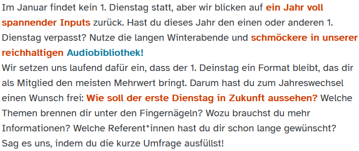 Wann: jeden ersten Dienstag im Monat, 19:30-21:00